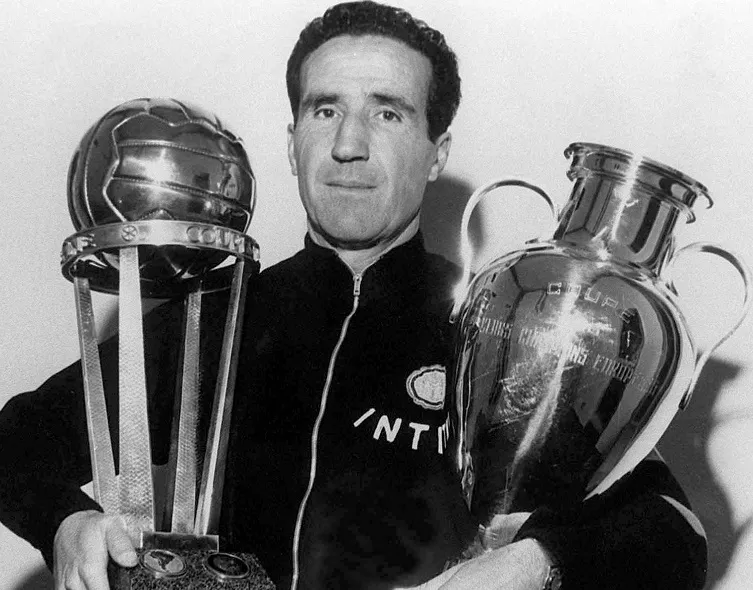 L’immense journaliste et écrivain italien Gianni Brera, notamment inventeur du terme « libero » et ex-rédacteur en chef de La Gazzetta dello Sport, l’avait décrit comme « un clown et un génie, vulgaire et ascétique, sultan et croyant, rustre et compétent, mégalomane et obsédé par la santé… Tout cela et même plus » . Helenio Herrera n’était pas un homme comme les autres. La preuve, il avait deux dates de naissance : 1910 et 1916. Né dans ces eaux-là au bord du Río de la Plata à Buenos Aires, Helenio quitte l’Argentine à quatre ans, direction Casablanca. Fils d’anarchistes espagnols réfugiés, Herrera débarque finalement à Paris à 16 piges, pour une carrière de défenseur d’un niveau tout à fait correct (convoqué deux fois avec les Bleus, il n’entrera jamais en jeu en match international). Entraîneur du Stade Français de 1946 à 1948, il quitte finalement la France pour l’Espagne.