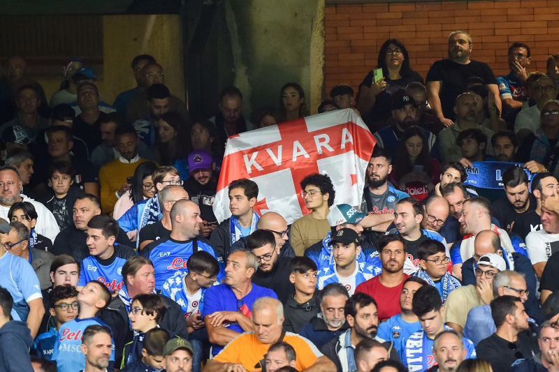 Un patronyme particulièrement difficile à prononcer pour le commun des mortels, ce qui incite le président Aurelio De Laurentiis à l’appeler « Zizi ». La presse et certains supporters des Azzurri ont quant à eux opté pour deux sobriquets bien plus évocateurs : « Kvaradona » et « Kvaravaggio ». Deux références à Diego Maradona et au peintre Caravage pas forcément évidentes à assumer pour le principal intéressé, recruté contre dix millions d’euros en provenance du club géorgien de Batumi et, de fait, très attendu. « Je sais ce que Diego représente pour les Napolitains et, par conséquent, c’est une énorme responsabilité pour moi », souffle Kvaratskhelia à l’occasion de sa présentation, en juillet dernier. La hype est née. Elle ne fait ensuite que se renforcer, au gré des performances étourdissantes du numéro 77 (le 7 étant déjà attribué à Eljif Elmas), dribbleur fou et finisseur clinique, qui facture déjà 12 buts et 14 passes décisives toutes compétitions confondues. Une hype devenue frénétique et dépassant de très loin les murs de Naples, que l’on appelle communément Kvaramania.