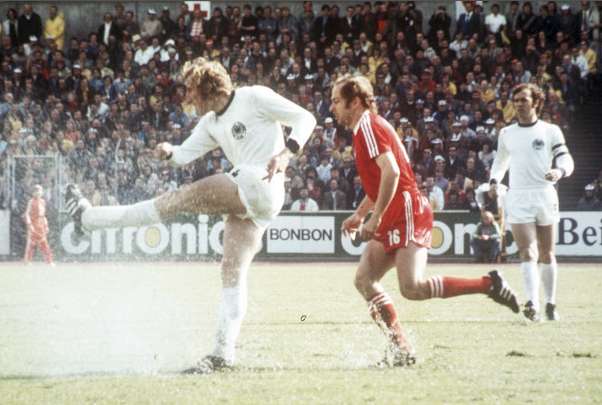De nombreuses raisons peuvent expliquer le sacre de la Nationalmannschaft à la Coupe du monde 1974. Il y avait évidemment l’instinct infaillible du Bomber Gerd Müller, l’élégance du Kaiser Franz Beckenbauer, les exploits du Katze Sepp Maier. Mais l’histoire aurait pu prendre une tout autre tournure si une simple flaque d’eau n’avait pas existé, ou plus généralement, si une pluie torrentielle ne s’était pas abattue sur Francfort le 3 juillet 1974. Ce jour-là, la NM affronte la Pologne. De l’avis de beaucoup, les Pays-Bas étaient la meilleure équipe du tournoi, et leur défaite en finale, imméritée. D’autres préfèrent choisir un troisième camp, celui des Polonais, comme Paul Breitner l’a avoué au site de la FIFA il y a quelques années : « Ils avaient une meilleure équipe à la Coupe du monde que l’Allemagne, les Pays-Bas, le Brésil, ou n’importe qui d’autre d’ailleurs. Les Polonais avaient la meilleure équipe en 1974. » De fait, la sélection polonaise est la grande surprise du tournoi. Bien qu’ils se soient débarrassés des Anglais en éliminatoires, personne ne s’attendait à les voir à ce niveau. Ils avaient même perdu contre Haïti deux mois avant le début de la compétition ! Pourtant, une fois les choses sérieuses commencées, leur jeu rapide et offensif, fait de redoublements et de permutations, basé sur des joueurs aussi talentueux que le milieu Kazimierz Deyna ou les attaquants Grzegorz Lato, Andrzej Szarmach et Robert Gadocha, impressionna tout le monde. L’Allemagne restait favorite, certes, mais il allait y avoir match. C’est pourtant une bataille qui a eu lieu.