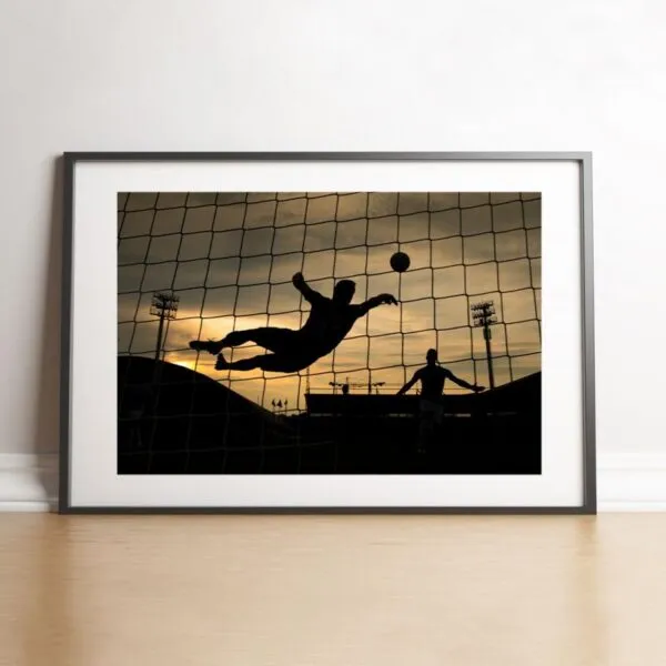 Commander ce tirageEn photographie, il est souvent déconseillé d’avoir la source de lumière, généralement le soleil, face à l’appareil. Mais quand le photographe maîtrise l’effet du contre-jour, cela peut donner de magnifiques clichés. C’est le cas ici. Prise lors d’un match de qualification pour la Ligue des champions entre Riga et Malmö le 13 juillet 2021, la photographie met bien en valeur Roberts Ozols, le portier letton, en pleine détente devant ce coucher de soleil en fond. Pas un hasard qu’il ait réuni une majorité de suffrages lors du vote en story Instagram de So Foot et du compte de la boutique.