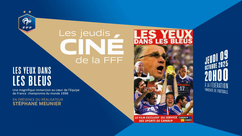 Le coup d’envoi des « Jeudis ciné de la FFF » aura lieu ce jeudi 9 octobre 2025 à 20h avec la projection du film Les Yeux dans les Bleus de Stéphane Meunier. Et Philippe Diallo, président de la Fédération française de football, en trépigne d’avance : « Le lancement des Jeudis Ciné de la FFF illustre parfaitement la volonté d’ouverture de notre Fédération. Volonté d’ouverture vers des univers culturels avec lesquels les passerelles sont multiples ; volonté d’ouverture vers des personnalités issues d’autres horizons, passionnées par le football, et dont le partage d’expérience est toujours enrichissant ; et volonté d’ouverture vers le grand public qui rêve, mais n’ose pas parfois, pousser les portes de notre belle institution. Cette première des Jeudis Ciné de la FFF, avec la projection du film Les Yeux dans les Bleus – ouverte à tout le monde et gratuite – est un beau symbole, un lien fort entre un passé glorieux et un futur que l’on espère radieux. »