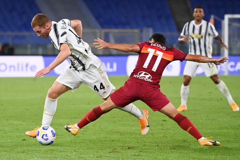 Malgré la prometteuse entame de saison des siens face à la Sampdoria la semaine dernière, Andrea Pirlo fait bizarrement le choix de repasser à quatre derrière. La Juve, disposée dans une formation en 4-4-2, semble tout de suite accuser le coup : Cuadrado zone bien trop bas sur le pré, Ramsey se dessèche sur son coté gauche et Bonucci, qu’on sait bien plus à l’aise dans une défense à trois, n’ose pas la moindre passe verticale pour ses attaquants. Pas brillante, mais beaucoup mieux en place, la Roma prend ses aises, dans le sillage d’un Spinazzola intenable sur son coté gauche. C’est néanmoins Mkhitaryan qui est d’abord tout prêt d’ouvrir la marque: lancé en contre, l’Arménien efface Bonucci dans la surface, mais gâche son face-à-face, qu’il envoie au chaud dans la niche de Szczęsny. Pas grave : Rabiot a les mains baladeuses ce dimanche et contre du bras un tir de Veretout à la demi-heure de jeu. Penalty. L’ex Stéphanois se fait justice lui-même et la Vieille Dame se retrouve assez logiquement menée.