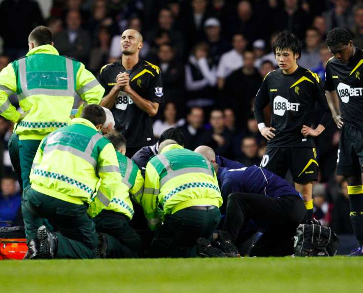 Le football est devenu bien dérisoire ce week-end en Angleterre. Samedi soir, à White Hart Lane, Tottenham affronte Bolton en quarts de finale de la Cup. Pendant presque une mi-temps, les deux équipes livrent un match haletant et sans aucun temps mort. Un match plaisant quoi. Jusqu’à cette putain de 42ème minute. Tandis que le ballon circule à 30 mètres de là, Fabrice Muamba, le milieu défensif des Wanderers, s’écroule face contre terre dans le rond central. Le joueur de 23 ans est victime d’un malaise cardiaque et les secours tentent de le ranimer pendant plusieurs minutes. Autour du joueur anglo-congolais, c’est l’angoisse. Rafael Van Der Vaart se prend la tête à deux mains, pendant que Nigel Reo-Coker et William Gallas se lancent dans une prière. Dans les tribunes, les supporters des deux clubs pleurent ou scandent le nom de Fabrice Muamba.