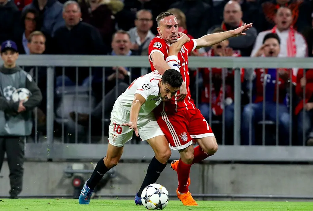 Sacré champion d’Allemagne (pour la sixième fois d’affilée) samedi dernier, le Bayern démarre ce match retour avec l’euphorie de celui qui vient de faire tomber quelques pintes. En cinq minutes, James Rodríguez a le temps de brosser un coup franc juste au-dessus de la cage, puis la spéciale Robben lèche le second poteau. Gabriel Mercado transpire déjà : le latéral sévillan repositionné en défense centrale à côté de Clément Lenglet a pris un carton jaune d’entrée. Heureusement, au milieu, les Andalous peuvent compter sur l’homme qui leur a fait défaut à l’aller, en étant suspendu. Éver Banega régule le jeu avec calme et finesse face à la machine de Jupp Heynckes. Pas rassasié d’avoir un quintette pour foutre le feu en attaque, Mats Hummels vient lui-même souffler sur les braises en envoyant une chiche de loin qui frôle la lucarne. La meilleure occasion est pour Ribéry, dont le crochet dévastateur se poursuit par une frappe lourde, mais trop sur le gardien. Dans le temps additionnel de la première période, la déviation habile de Ben Yedder pour Sarabia nécessite un sauvetage in extremis de Rafinha et vient rappeler au Bayern que Séville est encore un sacré poil à gratter, à la hauteur de l’évènement.