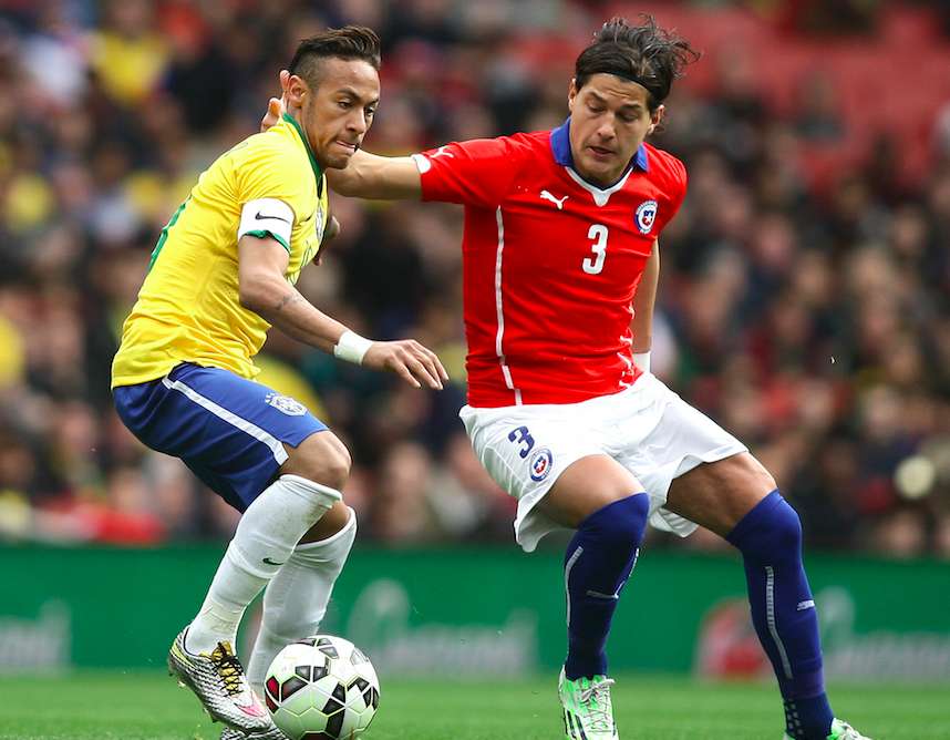 Et comme prévu, c’est bien le 3-5-2 de Jorge Sampaoli qui s’empare du jeu et du ballon. Pressés dans un premier temps, les Brésiliens s’en remettent aux numéros de Neymar pour respirer et à leur pressing pour contrer, mais la défense à trois chilienne s’écarte toujours assez pour conserver le ballon. Alors que Neymar encaisse et rend les coups, Alexis Sánchez répond avec quelques coups du sombrero dans son « Emirates » . À la 20e minute, le match sort de son aseptisation londonienne et revient en Amérique latine le temps de quelques instants. Gary Medel et Neymar se chamaillent sur un coup d’épaule.