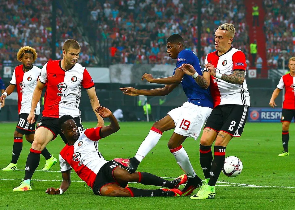 Mourinho a donc décidé d’offrir les premières titularisations de la saison à Darmian, Rojo, Smalling, Schneiderlin et Rashford dans un 4-3-3 neuf face à un Feyenoord leader d’Eredivisie et qui a remporté ses cinq rencontres de championnat jusqu’ici. Les hommes de Giovanni van Bronckhorst ont des armes, malgré l’absence d’Elia, et cela se voit rapidement au cœur d’une première période dominée dans le jeu par la troupe du capitaine Kuyt. Cette fois encore, United peine dans l’animation offensive avec un Rashford esseulé et des latéraux, Rojo et Darmian, à la peine, alors que Bailly tient la baraque tout seul derrière. La seule satisfaction est à venir de Morgan Schneiderlin, plutôt costaud dans son rôle de seul récupérateur entre Herrera et Pogba. L’unique grosse alerte vient de Martial d’une frappe puissante à côté du but de Jones, alors que le Feyenoord a grillé une belle cartouche au terme d’une action collective mal terminée par Toornstra avant la pause.