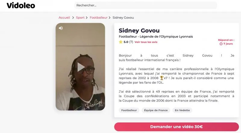 La coupe de cheveux. Il y a quelques mois encore, c’était le seul point commun entre Snoop Dogg et Sidney Govou. Mais depuis quelques semaines, les deux hommes en partagent un autre : ils réalisent des vidéos personnalisées pour leurs fans, contre une rémunération. Pour le plus grand fumeur de weed d’outre-Atlantique, cela se passe sur Cameo, pionnier américain du business, contre 1000 dollars. Pour l’homme qui a acheté une 206 après son doublé contre le Bayern, l’affaire a lieu sur le leader français, Vidoleo, pour 30 euros. Comme de plus en plus de personnalités du ballon rond, l’ancien Lyonnais a rejoint la plateforme française. À tel point qu’aujourd’hui, le football représente 5% des activités de Vidoleo.