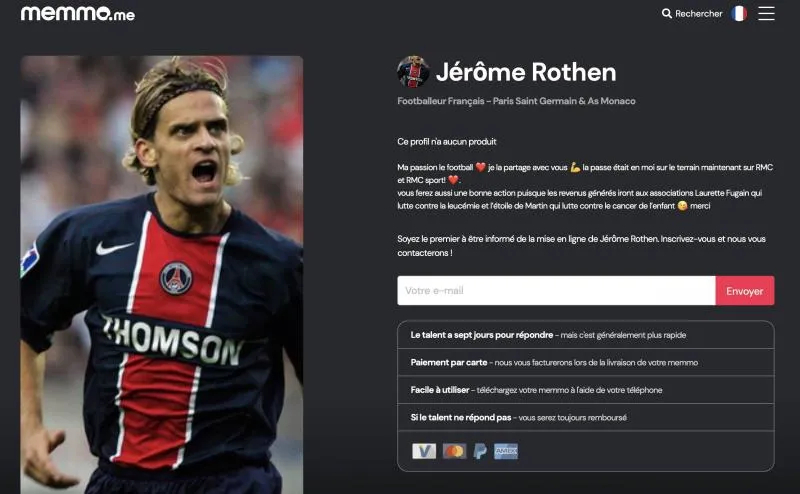 Cocorico ! Le succès n’a pas tardé à suivre. Les trois entrepreneurs ont même quitté leurs emplois respectifs pour s’investir à 100% dans leur nouveau bébé. « On savait que la demande allait devenir de plus en plus importante », assure Nicolas. « Rudy et moi, on adore le foot, on a joué dans le même club de nombreuses années. » C’est donc tout logiquement que les trois larrons ont commencé à attirer des joueuses et joueurs dans leur filet, en activant leur réseau et en suivant les demandes des clients. « On a voulu ne pas trop axer téléréalité ou influenceurs pour avoir un catalogue très large avec des artistes et des sportifs, continue l’entrepreneur. Qu’on aime la musique, le cinéma, le sport : on peut trouver quelqu’un qui nous plaît sur Vidoleo. » Dernière prise : Jérôme Rothen, qui porte pour l’instant les couleurs de Memmo, un concurrent suédois, et qui raconte : « Un des fondateurs de Memmo m’a appelé pour me proposer cette application. Je ne connaissais pas. Il m’a expliqué ce que c’était : faire des messages à des gens pour égayer leur journée. » Bingo, l’ancien Parisien en est.