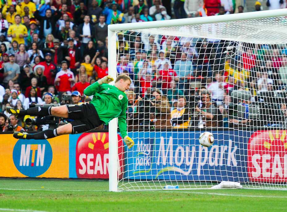 Cinq ans après, la simple évocation du nom de Jorge Larrionda suffit certainement à faire remonter des souvenirs douloureux chez de nombreux supporters anglais. Car le dimanche 27 juin 2010, le natif de Montevideo est devenu persona non grata en Angleterre, voire même ennemi public numéro un. Le lieu du crime ? Le Free State Stadium de Bloemfontein en Afrique du Sud. Ce jour-là, dans une enceinte nourrie par les bruits assourdissants et déjà insupportables des vuvuzelas, Allemands et Anglais se disputent une place en quarts de finale de la Coupe du monde. Donnés favoris par tous les bookmakers, les protégés de Joachim Löw font rapidement honneur aux pronostics en ouvrant le score dès la 20e minute de jeu. Miroslav Klose s’amuse de Matthew Upson et crucifie le pauvre David James. L’Allemagne semble lancée. Douze minutes plus tard, Thomas Müller et ses chaussettes baissées décalent d’un lob astucieux Lukas Podolski pour le 2-0. Les Anglais sont à la rue. La moindre accélération allemande fait passer Terry et Upson pour des retraités venus participer à un jubilé. L’Allemagne semble se diriger tout tranquillement vers le prochain tour. Et pourtant. À la 37e minute, Gerrard décide enfin de réussir un centre et sert parfaitement Upson qui réduit le score, bien aidé par un Neuer parti cueillir quelques pâquerettes.