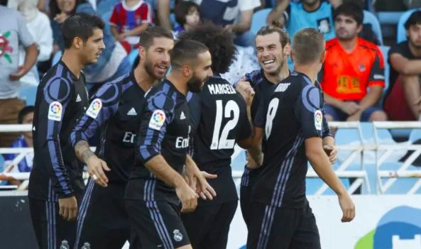 On joue depuis une minute à Anoeta. Servi par une ouverture côté droit, Dani Carvajal exécute un centre somptueux pour trouver, entre les deux défenseurs centraux basques, Gareth Bale. La tête croisée du Gallois ne laisse aucune chance au portier de la Real, Gerónimo Rulli (0-1, 1re). Pas de doute, le Real est déjà dans le ton de sa saison. Privé de nombreux cadres (Navas, Pepe, Modrić, Cristiano Ronaldo et Benzema), ce premier déplacement avait pourtant tout l’air d’un traquenard. Mais impossible pour les Merengues de décevoir, pour la première rentrée en tant qu’entraîneur principal de Zinédine Zidane. Après avoir décroché la Supercoupe d’Europe le 9 août dernier contre le FC Séville (3-2), ses protégés commencent la saison sous les meilleurs auspices et répondent parfaitement à la large victoire du Barça face au Bétis (6-2).