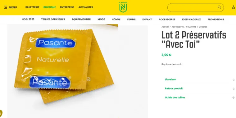 Les supporters nantais n’ont pas vraiment de quoi grimper au rideau cette saison, avec un coach mis à la porte, une 13e place à la mi-saison et 19 buts inscrits en 17 rencontres, dont plus du quart marqué face à Lorient en septembre dernier. Ils peuvent cependant toujours se consoler avec une boutique qui regorge de produits dérivés originaux, comme ce lot de deux préservatifs « Avec toi », qui peut faire office de cadeau à petit prix à un copain ou une copine canari(e). Attention, il sera question d’être vif quand un nouveau stock de cette pièce unique sera mis en vente, car le premier lot s’est écoulé en quelques heures. Cela permet au moins de rappeler qu’il est important de sortir couvert, même quand ce n’est pas l’hiver.