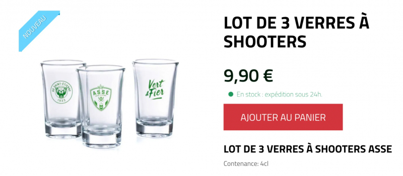 Un beau remède contre l’effet « mon club historique végète en Ligue 2 » : le lot spécial de trois shooters aux couleurs des Verts proposé par l’AS Saint-Étienne. Une bonne idée pour se consoler entre ami(e)s après une défaite face à Quevilly-Rouen ou bien pour fêter une victoire comme il se doit, puisque l’ASSE a quand même bouclé son année par un succès à la maison contre Bastia. Qui c’est les plus forts ? Évidemment, c’est les verres.