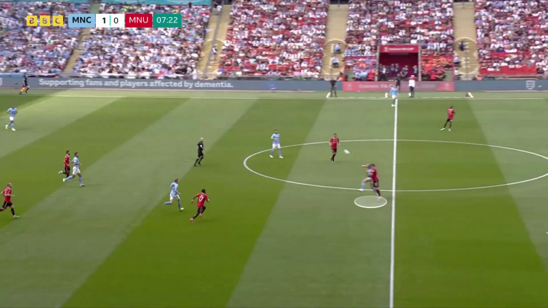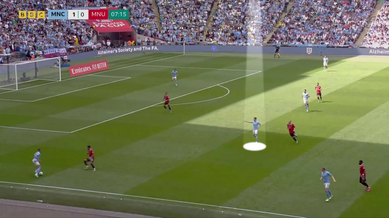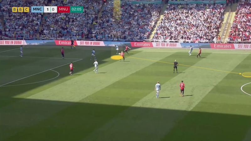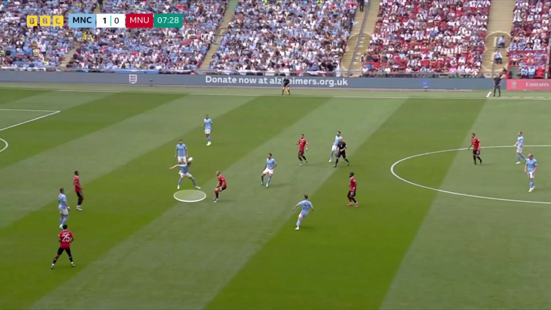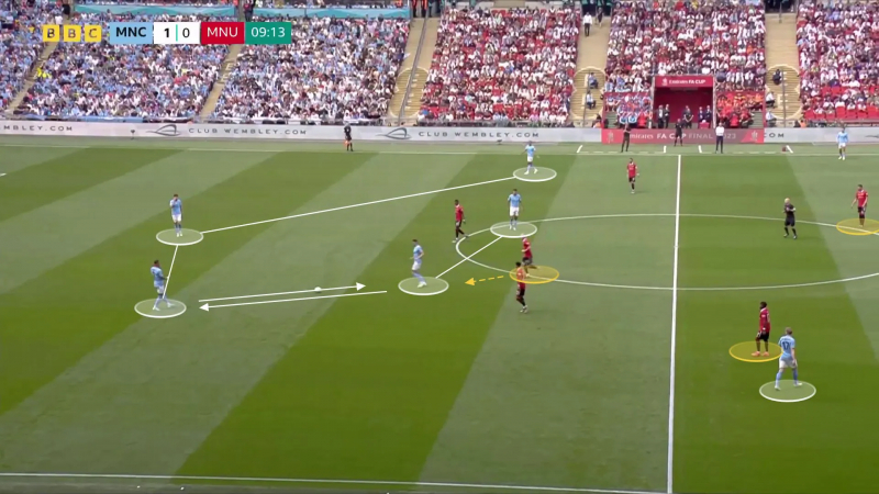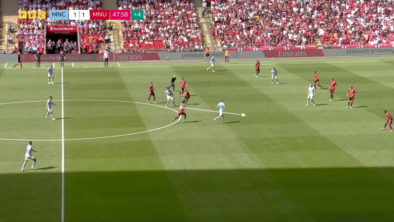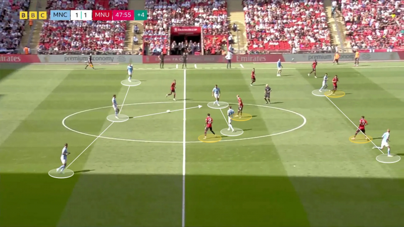 Même situation en fin de première période où, trouvé par Rúben Dias, Rodri va attirer Eriksen sur lui, alors que Fred et Casemiro sont toujours occupés par De Bruyne et Gündoğan…