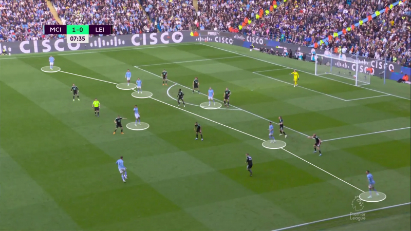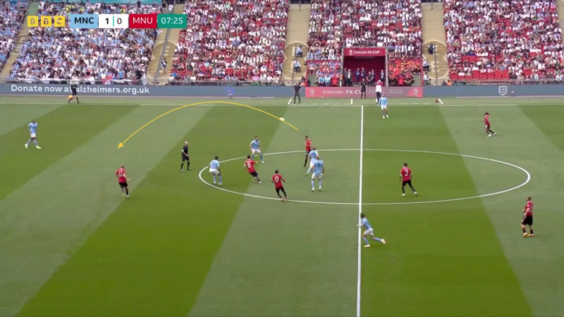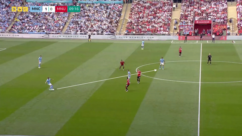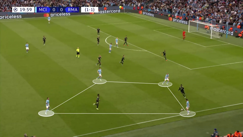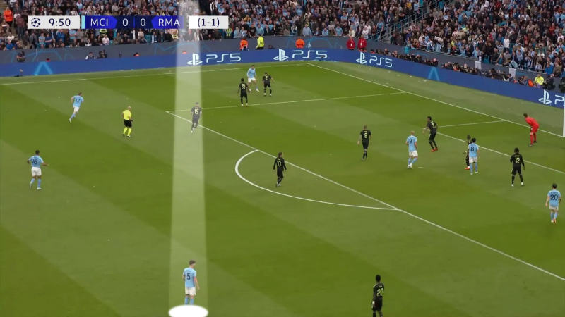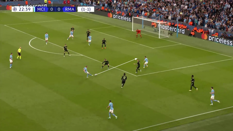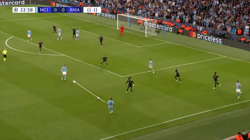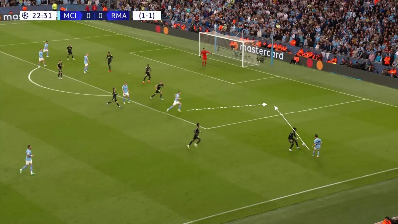 Cette utilisation de Stones permet surtout de créer une supériorité numérique dans toutes les zones du terrain. On l’a vu dans le cœur du jeu, mais on le voit aussi sur les côtés où le 3-2-5 permet de créer un quatre contre trois sur les côtés, ce que ne permettait pas le 2-3-5 de la saison précédente. On le voit sur cette séquence, et ça a surtout été payant sur la situation du 1-0 face au Real…