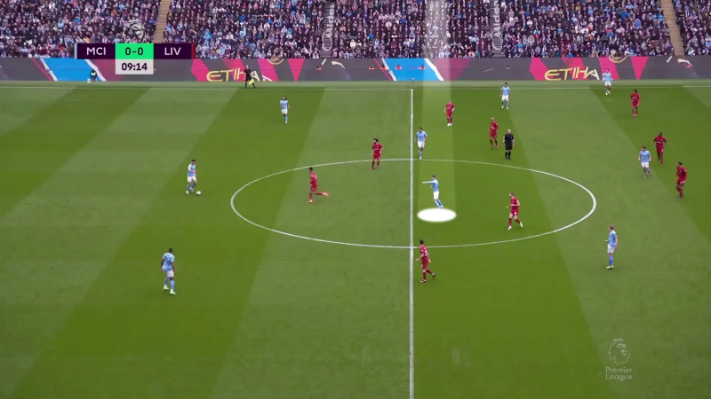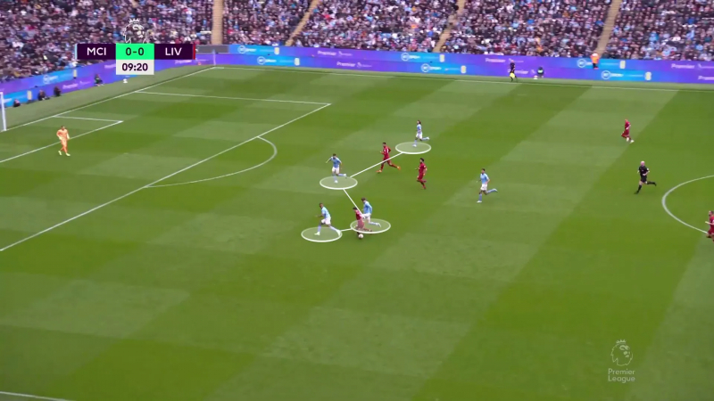 Autre situation face à Liverpool il y a plusieurs semaines, où Stones est de nouveau placé aux côtés de Rodri en phase de construction…