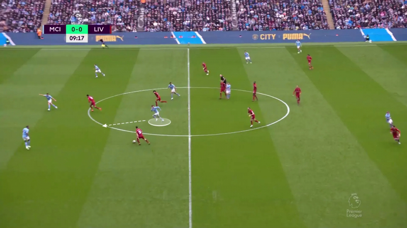 … mais trois secondes plus tard, City va perdre le ballon, laissant Jota en position d’enclencher une transition offensive pour Liverpool…