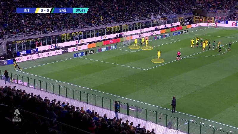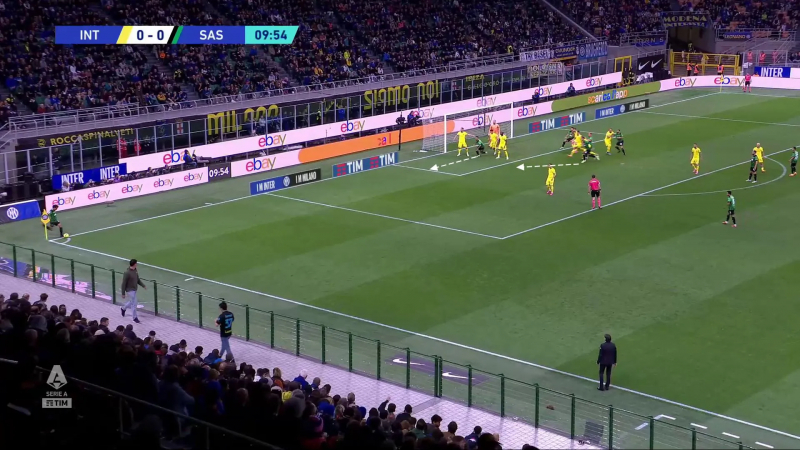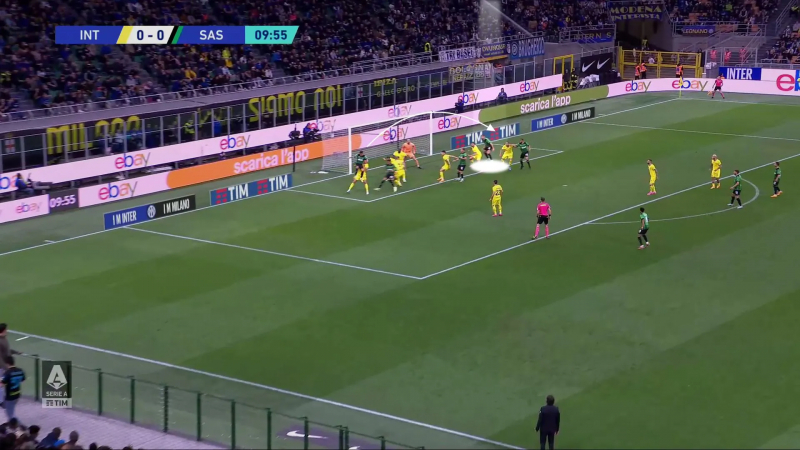 Cette saison, on a souvent vu un attaquant adverse venir faire bloc dans cette zone, accompagné d’un autre tentant d’en profiter. Face à Sassuolo, on a vu une autre situation avec la course d’un attaquant pour faire sortir un défenseur de l’Inter, accompagnée d’autres courses visant à libérer les six mètres…
