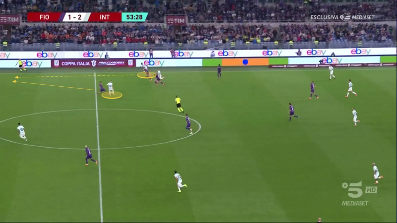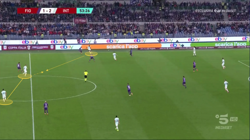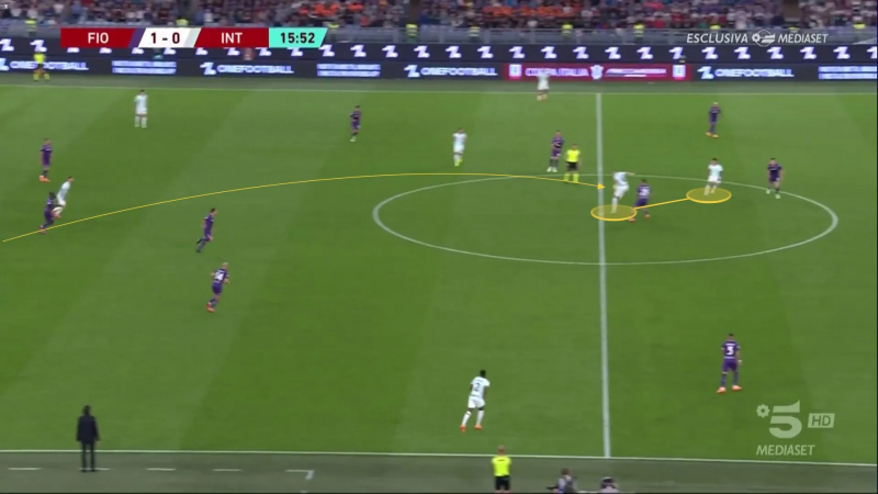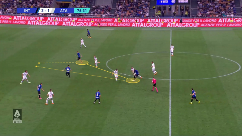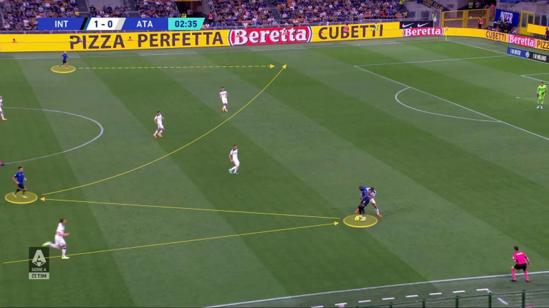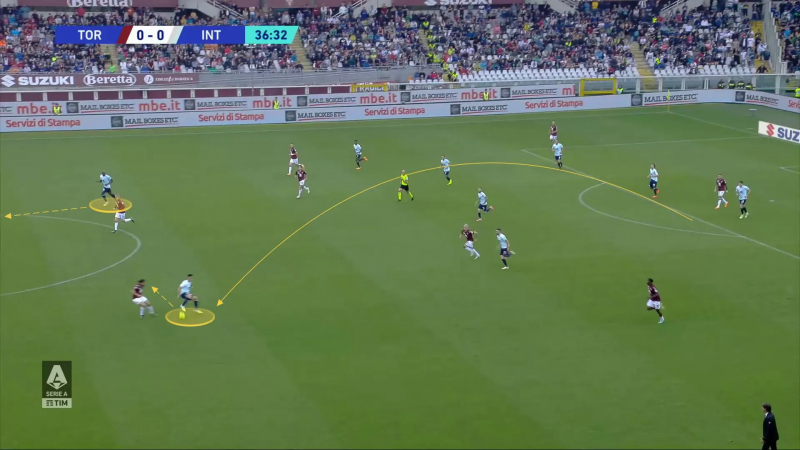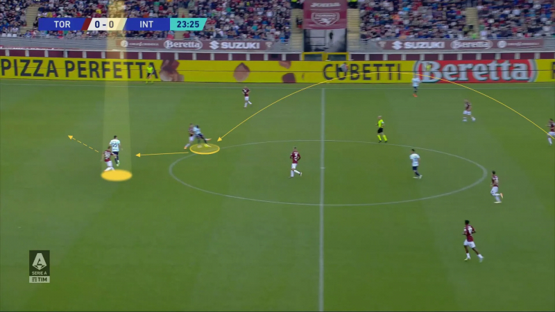 Ici, Lukaku est touché dos au jeu, collé au défenseur adverse et remise vers Martinez en retrait. L’Argentin changera ensuite le jeu à l’opposé, en une touche, vers Dimarco.