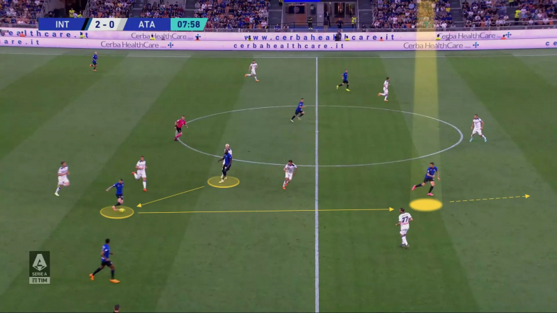 Exemple de sortie de balle face à l’Atalanta (3-2) : l’Inter fait ici grimper Acerbi d’un cran, Bastoni reste dans l’axe aux côtés de D’Ambrosio, Dimarco reste dans son couloir, alors que Barella a décroché côté droit, laissant Dumfries grimper d’un cran.