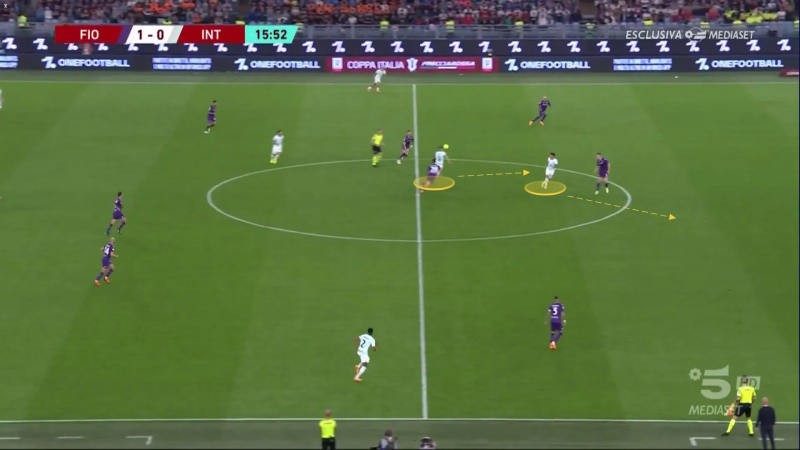 … le milieu nerazzurri peut gêner, mais n’est pas assez proche pour fermer. Le central adverse peut alors contrôler, se retourner et servir l’appel en profondeur dans le dos de D’Ambrosio.