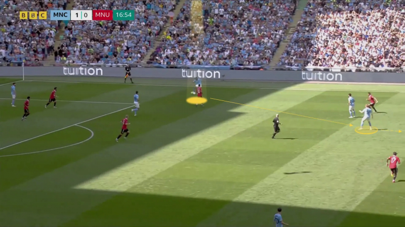 Une opportunité que pourrait parfaitement exploiter Manuel Akanji grâce à ses pieds et son orientation naturelle. Ici, le pressing de United lui ouvre la porte vers Erling Haaland (hors champ), alors il l’emprunte.