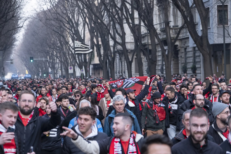 L’Américain n’a pas tort, c’est dingue. Si la place met du temps à se remplir, au point que le début d’après-midi soit un poil décevant et très calme par rapport aux chiffres annoncés, la marée rouge et noir ne cesse de déferler et de s’animer sur les coups de 16h. Les chants se multiplient, les fumigènes sont de sortie et les tramways ont le droit à leur haie d’honneur et à quelques sticks, évidemment. Il y a des jeunes et des moins jeunes ; des amis et des familles ; des garçons et des filles. « On a fait un mot à l’école », sourit la famille Lecharpentier accompagnée de deux de ses filles, et dont le père Matthieu est connu pour être l’archiviste du site RougeMémoire. Le premier cortège part aux alentours de 16h30 pour rejoindre une station de métro, où des rames seront dédiées aux fans rennais. Le contingent est impressionnant, le bruit aussi. Aux fenêtres, les Italiens sortent leurs téléphones pour filmer le défilé, il paraît que ce n’est pas commun à Milan. « Qu’est-ce qui se passe, pourquoi tout ce monde ? » demande une femme âgée en traversant un passage piéton. La réponse la laisse circonspecte, elle peut continuer son chemin loin de la bande bretonne.