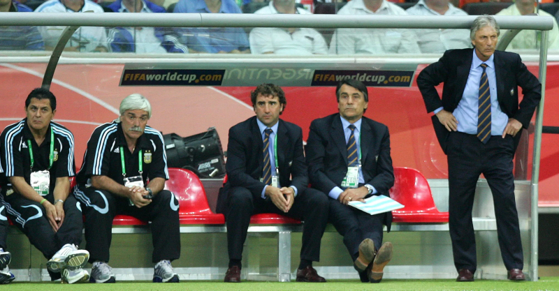 Avant de rappeler Riquelme sur le banc et de lancer Cambiasso, José Pékerman prend alors rapidement conseil auprès de ses deux adjoints, Hugo Tocalli (58 ans) et Néstor Lorenzo (40 ans). Ce dernier approuve le remplacement afin de préserver Romy, utilisé intégralement lors des quatre matchs précédents (sauf les 10 dernières minutes face aux Oranje en poule, 0-0) en vue d’une demie disputée très certainement contre la redoutable Italie, favorite de son quart face à l’Ukraine le même soir à 21 heures. Lorenzo suggère toutefois l’entrée de Pablo Aimar à la place de Juan Román, au registre similaire de playmaker. Mais Hugo Tocalli, l’ancien, tranche net : sortir Riquelme déstabiliserait l’équilibre de l’équipe bien en place. Romy en a encore sous la pédale et ce serait envoyer un message de faiblesse à Klinsmann et à son adjoint avisé, Joachim Löw. José Pékerman est alors convaincu : Romy reste. Cambiasso ne sera pas le substitute cher à Vikash Dhorasoo.