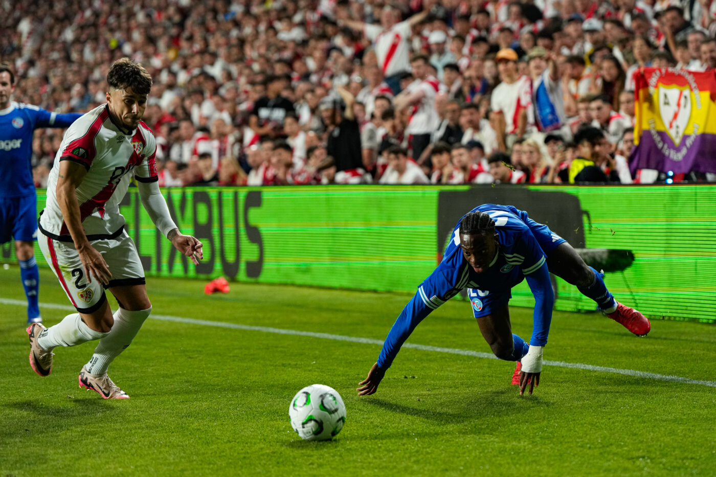 Hormis une frappe trop enlevée de Ben Chilwell (15e), venue heurter le mur emblématique du stade de Vallecas, la seule action mémorable du premier acte a été le combat de coqs entre Diego Moreira et Pep Chavarría lors duquel le Strasbourgeois a assené un coup de coude au défenseur adverse, finalement non sanctionné. Bien plus scolaires que d’habitude, les Racingmen ont largement canalisé les Espagnols, fermant le maximum d’espaces dans l’entrejeu, même si l’absence de Valentín Barco a particulièrement pesé dans le manque de créativité des Alsaciens.
