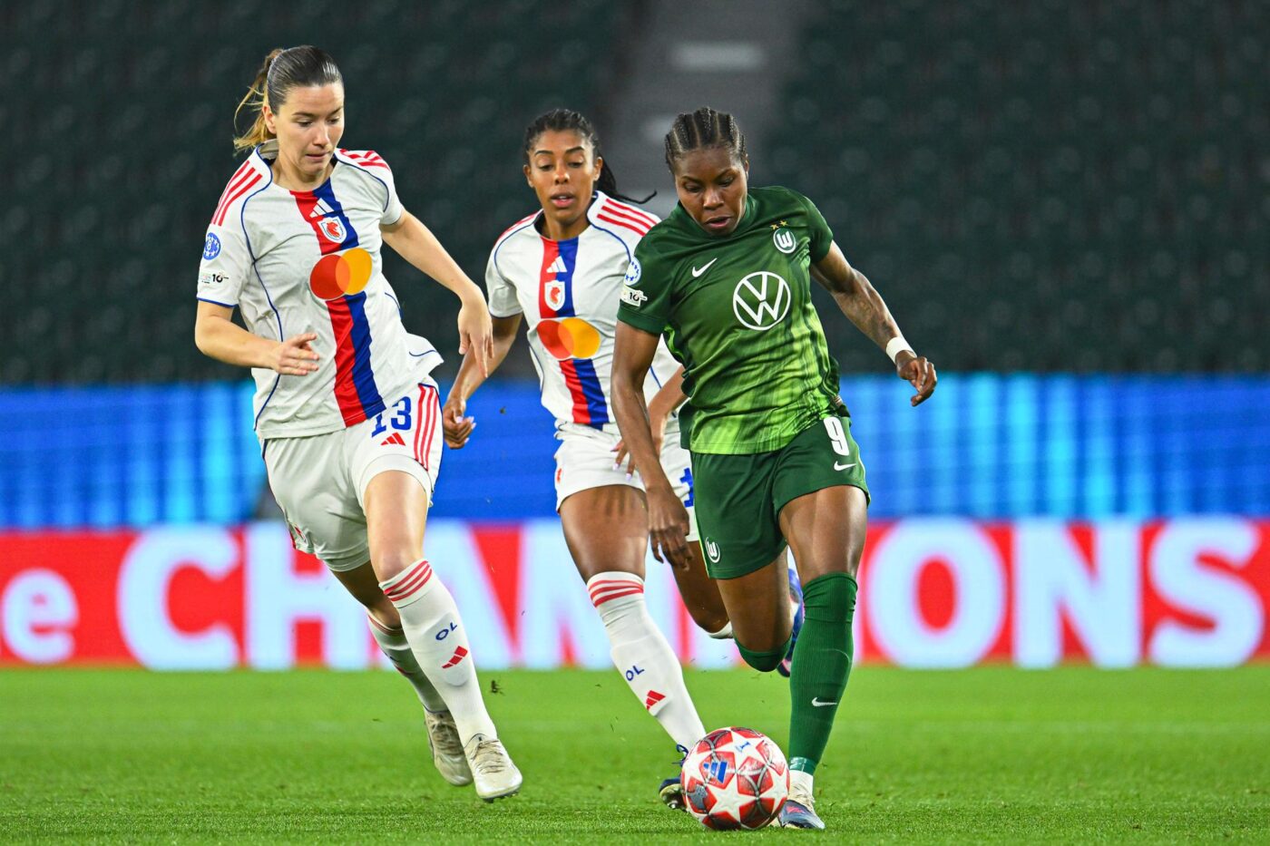 Tout s’est sans doute joué dans le premier quart d’heure à la Volkswagen Arena. Bousculées d’entrée, les coéquipières de Wendie Renard n’ont pas fait le début de match qu’elles espéraient, et se sont vite retrouvées piégées par le pressing agressif des Allemandes. Décomplexées et volontaires, les joueuses de Stephan Lerch étaient logiquement les premières à frapper un grand coup. Vivien Endemann déboulait sur le couloir gauche avant de servir dos au jeu Lineth Beerensteyn, qui se sortait de la densité par un ingénieux double contact. Derrière, la frappe de l’internationale néerlandaise était malencontreusement déviée par Damaris Egurrola : une interférence pas prévue qui prenait à contrepied Christiane Endler et donnait vite l’avantage à Wolfsburg (1-0, 14e). Douché et piqué à vif, l’OL a mis du temps avant de vraiment entrer dans son match. La formation de Jonatan Giraldéz aurait vite pu revenir dans le match mais les imprécisions successives de Melchie Dumornay puis Tabitha Chawinga dans la surface de réparation ne l’ont pas permis.