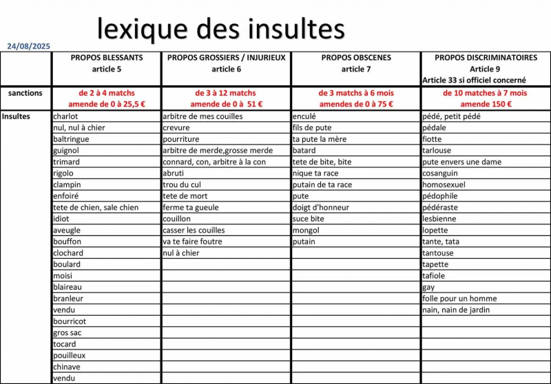 Plus sérieusement, pour cette rentrée sportive 2025, la LGEF vient d’envoyer un mail à tous les clubs des 9 districts qu’elle régit leur présentant « un lexique non exhaustif des propos qui sont considérés comme inappropriés sur un terrain », sous la forme d’un tableau où figure également un barème financier et disciplinaire pour chaque propos. « Heureusement que le mail était daté du 24 août, sinon j’aurais crû à un poisson d’avril », rigole un dirigeant, souhaitant rester anonyme parce que « bon, on ne sait jamais avec les arbitres. Nous, on joue la montée. » Ne jamais insulter l’avenir, certes. Ni l’arbitre d’ailleurs. C’est tout l’enjeu du courrier, de prime abord pédagogique, signé par le président de la commission de discipline régionale, Éric Mode.