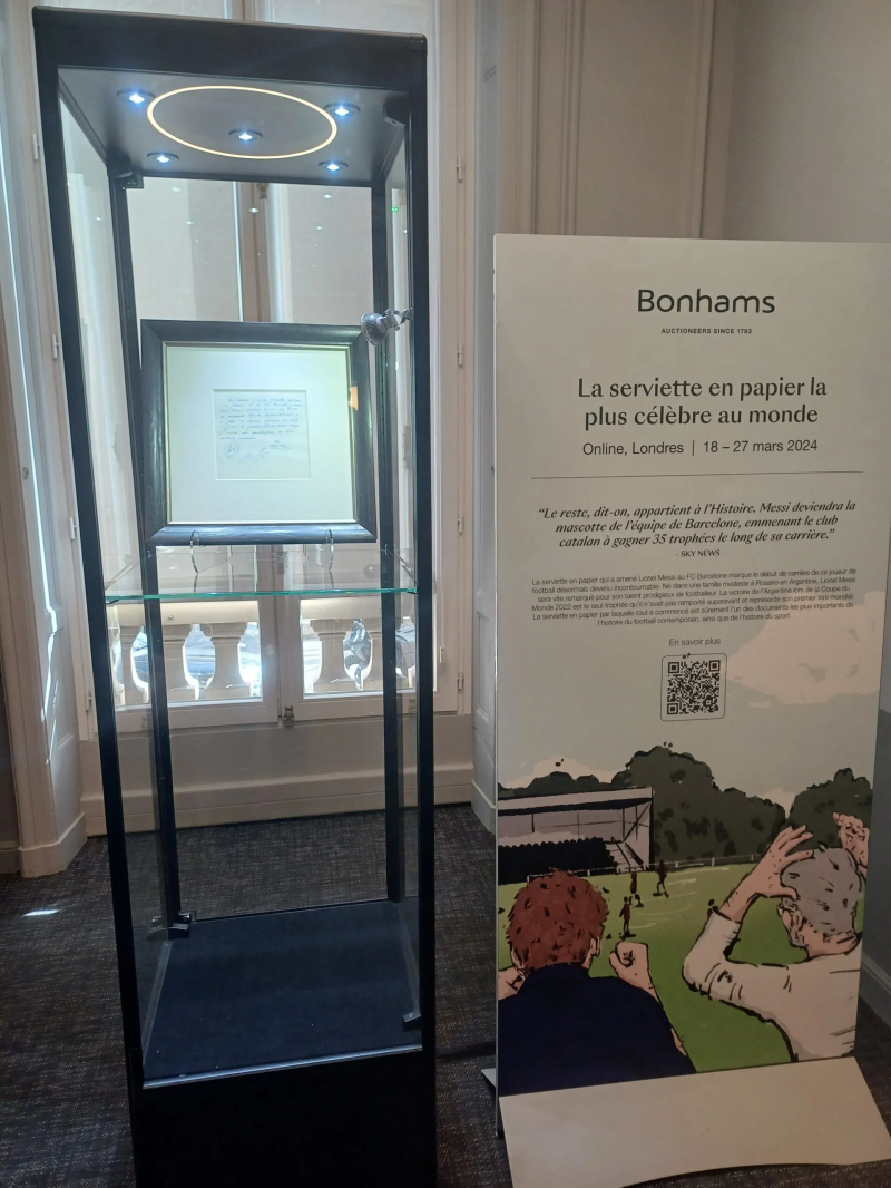 « Le début de la carrière de Messi est documenté ici. C’est simplement incroyable », s’enthousiasmait ces derniers jours pour l’AFP Ian Ehling, directeur des beaux livres et manuscrits à New York pour Bonhams en affirmant s’attendre à ce que la vente soit conclue pour « beaucoup plus cher » que le prix de départ. « À mon époque, on rêvait de défendre comme Beckenbauer, de dribbler comme Chris Waddle. Et, un peu plus tard, de faire des roulettes à la Zidane. Cette serviette est, à mes yeux, un véritable talisman. De même qu’elle est l’incarnation de la quintessence de notre métier, on est des chercheurs de trésors », embraye pour sa part Sabine Cornette de Saint-Cyr, en charge de l’exposition parisienne au moment de l’inaugurer. Et ravie de pouvoir amener ses enfants, pour une fois excités à l’idée de venir observer l’une des œuvres exposées par la maison : « C’est un précieux parchemin, qui a permis de changer la vie d’un jeune homme d’origine modeste. Pour moi, c’est le document le plus important du football mondial. Cela fait vingt ans que je suis dans le milieu des enchères, et je n’ai jamais vu ça de ma vie. Ça nous rappelle Picasso, qui dessinait sur des coins de table. C’est presque une œuvre d’art, c’est rarissime. »