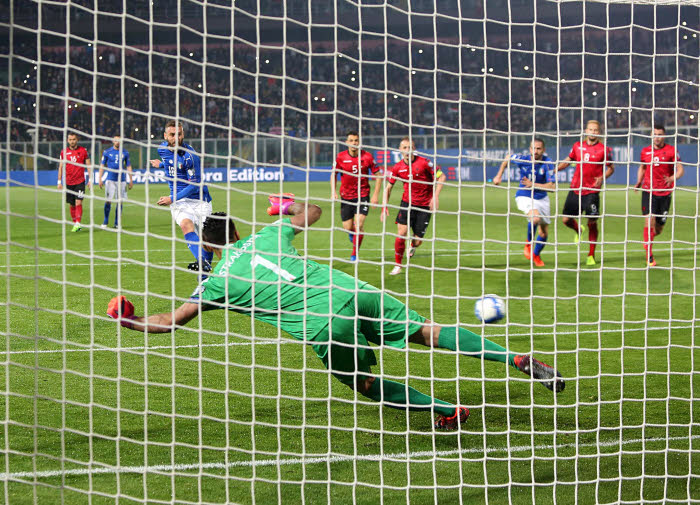 La 1000e valse de Gigi. À l’heure de célébrer sa 168e sélection avec la Nazionale, le portier de la Juve a forcément en tête ce cap des 1000 matchs joués en professionnel qu’il atteint ce soir. De quoi inciter ses coéquipiers à faire rapidement péter le champagne pour honorer leur Capitano. Dans un 4-2-4 très offensif sur le papier, les hommes de Giampiero Ventura laissent d’abord l’Albanie se procurer une belle occasion en début de match par son avant-centre, Cikalleshi, dont la frappe frôle le poteau italien. Puis les Azzurri reprennent leurs esprits en obtenant un penalty grâce à Belotti, déséquilibré dans la surface à la suite d’un coup franc de Verratti. Les supporters albanais ont beau balancer quelques fumigènes sur la pelouse du stade Renzo Barbera de Palerme afin d’essayer de déconcentrer De Rossi, le milieu de la Roma transforme la sentence froidement en trouvant le petit filet de Strakosha. Pas de quoi assommer l’Albanie, qui sait toujours se montrer dangereuse en développant des séquences de jeu verticales et rapides. Sur l’une d’elles, Roshi, trouvé d’une longue ouverture en profondeur, se paie le luxe de prendre de vitesse Barzagli avant d’armer face à Buffon, qui bloque sans s’affoler la tentative de l’ailier albanais. Pour le reste, Verratti multiplie les tacles de bonhomme, Belotti galope de partout, et Davide Zappacosta, le très remuant latéral du Torino, arrose la surface adverse en centres sans parvenir à trouver les attaquants azzurri. La Nazionale regagne les vestiaires avec un seul petit but d’avance.