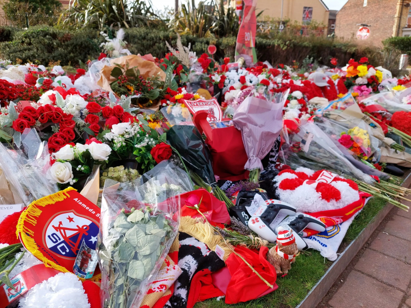 Au pied de la Main Stand et de ses briques orangées, les pelouses ont gardé leur couleur rouge. Une grande partie des écharpes, des fleurs et des maillots, spontanément déposés, ont été retirés. Ils seront prochainement recyclés par une entreprise spécialisée pour créer une sculpture commémorative, qui tiendra compagnie à celles de Bob Paisley et Bill Shankly. Un petit bout de terre a malgré tout été préservé. Les écharpes sont nouées autour des arbres, déjà parés pour l’hiver. Les bouquets s’étalent. Des roses blanches et rouges, beaucoup, mais aussi des tournesols, du lys ou des chrysanthèmes. Les maillots se mélangent aux drapeaux, aux manettes de PlayStation et de Xbox, aux dessins d’enfants, aux photos. Des pièces de 20 centimes, aussi, laissées dans l’herbe en clin d’œil à l’éternel numéro 20 des Reds. Ce lundi, à Anfield, Diogo Jota était partout. Sauf à la place qui aurait été la sienne sans le tragique accident du 3 juillet.