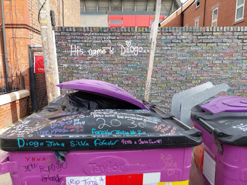 Sur Walton Road, Diogo s’affiche sur la façade d’un pub, The Halfway House, avec un large sourire, célébrant l’un de ses 65 buts chez les Reds en formant un cœur avec ses doigts. Sur Sybil Road, les briques rouges ont totalement disparu, noyées dans les milliers de messages de fans, autour d’un « Forever 20 » peint en blanc, sobre mais éloquent. Le mur est plein à craquer, tellement que les mots d’amour et les cœurs ont débordé sur les dalles posées au sol, sur les poteaux électriques, sur le séparateur de voies qui traînait par là et même sur les poubelles. Quelques supporters plissent encore les yeux en ce premier week-end d’août, à la recherche d’une brique vierge de tout coup de crayon pour rendre hommage au défunt. Les stylos passent naturellement de main en main. Les enfants s’agenouillent pour écrire par terre, certains s’allongent même pour dessiner au mieux. « C’était une évidence d’écrire quelque chose pour lui, glisse Emma après avoir laissé un « RIP Jota, de la famille Thompson », sur le mur. Il faisait partie de l’équipe depuis des années. C’est important pour moi. C’est notre club, on le supporte. »