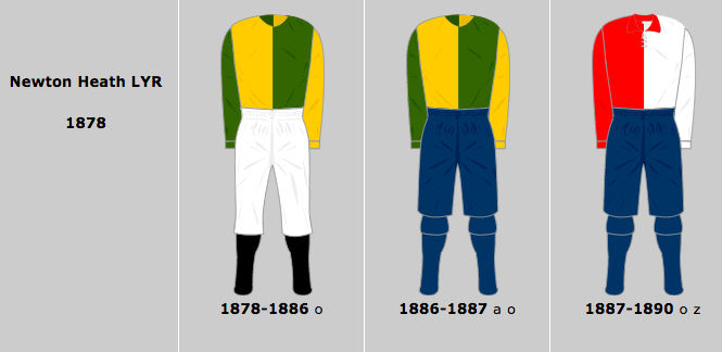 Fondé en 1878 par des ouvriers de la Lancashire and Yorkshire Railway, à Newton Heath, le club de Manchester prend logiquement le nom de Newton Heath LYR. D’abord motivés par la perspective d’affronter les équipes d’autres entreprises, les joueurs commandent un jeu de maillots aux couleurs de la LYR, le vert et l’or. Quelques années plus tard, le club rejoint la Football Alliance – alors rivale de la Football Association – et opte pour des maillots rouge et blanc. En 1892-1893, alors que le club revient à ses couleurs d’origine, le vert et l’or, la LYR se retire du club, qui se retrouve alors sans soutien financier.