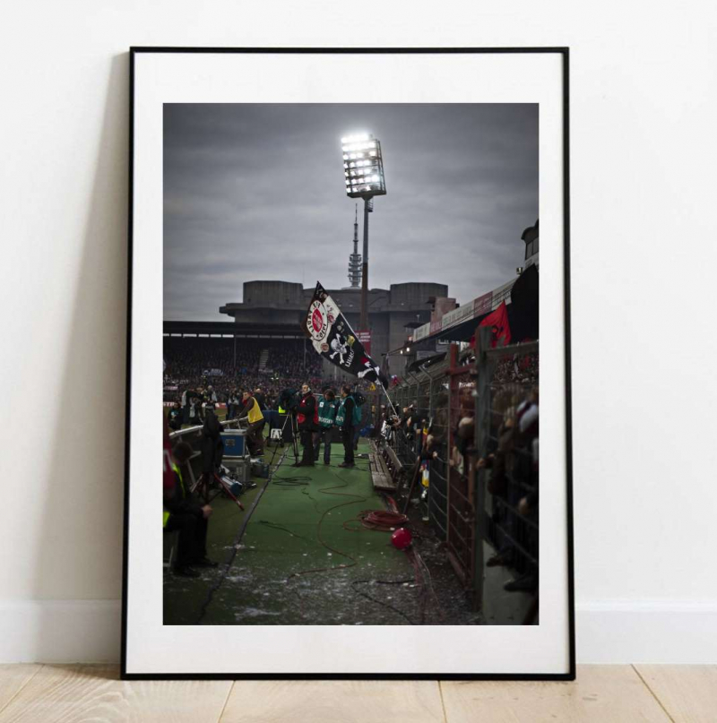 Un espace de moins de 3 mètres, entre un rectangle d’herbe, et une tribune qui crache des chants, des applaudissements, des sifflets, des encouragements, des insultes et invectives, des tifos et parfois des drapeaux. Ici Sankt Pauli. Cette photo prise lors d’une journée de Bundesliga 2011 face au VfB Stuttgart a retenu l’œil de la rédac pour son esthétisme et les symboles présents. Car sur une même ligne, on dénombre ici pas moins de cinq plans dont quatre ultra-symboliques de ce club ô combien mythique qu’est le FC Sankt Pauli, connu pour ses engagements antifascistes et antiracistes. Dans le même axe que la bande de fausse herbe et le drapeau à tête de mort se dressent le fameux et imposant lampadaire du Millerntor Stadion, puis le bunker datant de la Seconde Guerre mondiale (aujourd’hui salle de concert bien connue à Hambourg) et enfin la tour Heirich-Hertz, située dans le centre de Hambourg et symbole de la ville du haut de ses 279,7 mètres.
