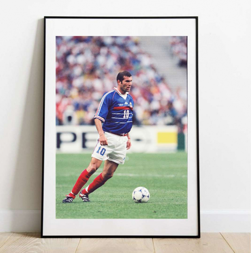Pas de 3e cliché sur Sankt Pauli, mais un énième sur Zizou. Hé oui. Et encore sur la finale de Coupe du monde 1998 face au Brésil. Car il y a des moments dans l’histoire du sport qui marquent à jamais les esprits. Et ce 12 juillet 1998 est gravé dans beaucoup de cerveaux et imprimé sur la rétine de millions de Françaises et de Français. Une image remonte tout de suite à l’évocation de cette finale synonyme de premier titre mondial pour nos Bleus : Zinédine Zidane. Auteur de deux buts de la tête ce soir-là, il incarne ici l’espoir, l’intensité et la gloire. Quelques secondes avant que la France n’entre dans l’histoire, le voici comme suspendu par un fil, prêt à tomber. Alors qu’au contraire, il prépare son ascension vers les étoiles. Nous avons choisi d’immortaliser encore plus cette image en la proposant dans nos beaux cadres, que vous pouvez désormais ajouter à votre collection.