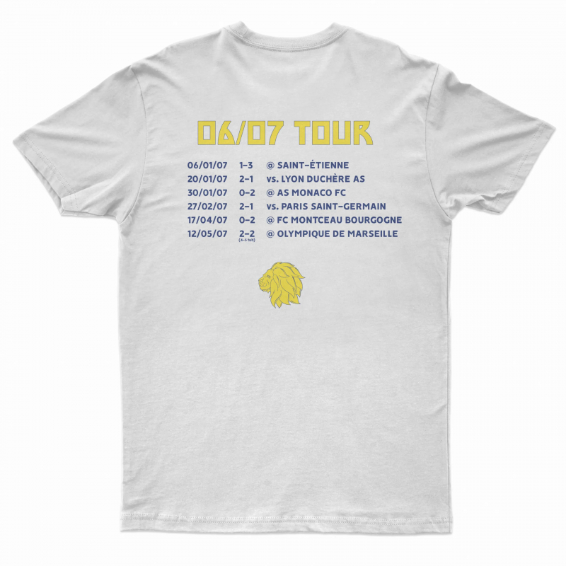 Pas de joueur cette fois, mais un club. Ou plutôt une campagne. Celle du FC Sochaux-Montbéliard lors de la Coupe de France 2007. Tombeurs de Sainté, de Monaco, du PSG et de l’OM en finale aux tirs au but, les coéquipiers de Dagano, Bréchet, Pichot et Leroy et Richert réalisent là le plus grand exploit de l’histoire des Lionceaux franc-comtois. Cela méritait amplement un t-shirt « On Tour » avec toutes les dates et scores.