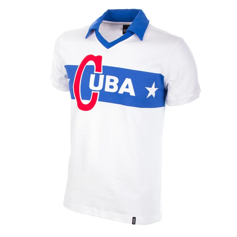 Last but not least, le maillot de Cuba 1962 ! Année où les footballeurs locaux n’ont pu le sortir qu’à deux reprises, à quelques jours d’intervalle, contre Porto Rico et la Jamaique. La Révolution et la crise des missiles n’ont pas aidé le foot à se faire une place. L’isolement a duré jusqu’en 1965, date a laquelle Cuba est revenu en force et a participé aux éliminatoires de la Coupe du monde 1966.