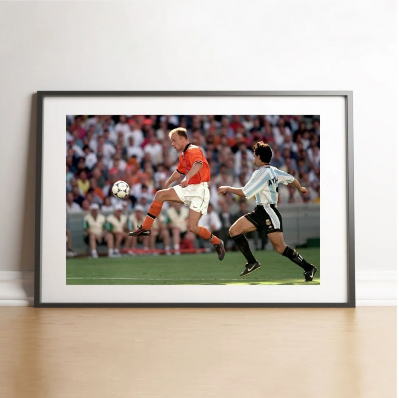 Le 4 juillet 1998, le stade Vélodrome accueille le quart de finale de la Coupe du monde en France. Les Pays-Bas d’Edgar Davids affrontent l’Argentine de Diego Simeone dans un Vélodrome plein à craquer. Après une première mi-temps disputée (1-1), les Oranje poussent en fin de seconde période. Sur la photo, Dennis Bergkamp contrôle le ballon d’un sublime portemanteau tout en échappant à Roberto Ayala sur une transversale de Frank de Boer. Sur le cliché, on peut ressentir la légèreté de la balle, le regard concentré de Bergkamp et l’effort d’Ayala pour récupérer ce ballon. Il n’y parviendra pas : le numéro 8 des Pays-Bas marque en réalisant un sublime combo sombrero volée du droit dans le petit filet. L’Argentine terminera sa compétition sur ce bijou de Bergkamp.