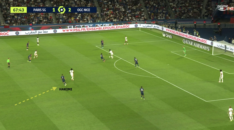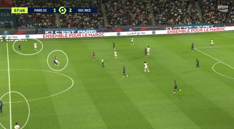 Pour tenir sur la largeur face à la ligne offensive à cinq têtes du PSG, Farioli avait cependant procédé à un ajustement en demandant à Ndayishimiye de venir constamment s’insérer en phase défensive entre Todibo et Dante, un rôle que l’international burundais a assumé sans aucun souci, assurant aussi bien dans la défense de sa surface (10 ballons repoussés) que dans ses compensations et ses duels défensifs directs. À ses côtés, ses deux centraux ont aussi été impressionnants, tandis qu’un cran plus haut, l’OGC Nice a su cogner à l’aide de plusieurs outils, dont le concept du troisième homme (un concept central du jeu de position), et faire mal à des Parisiens qui ont quasiment toujours choisi de jouer en un contre un derrière, mais qui n’ont jamais réussi à enfermer un Terem Moffi déchaîné. Le Nigérian a alors réussi à d’abord piquer une seconde fois dans sa soirée parisienne en se retrouvant au bout d’une ouverture de Sanson, couchant Danilo avant de trouver Laborde face au but vide, puis une troisième en venant, 15 minutes plus tard, transformer une inspiration de l’ancien Montpelliérain en doublé.