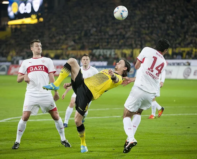 Dortmund et sa marche en avantJürgen Klopp voulait gagner. Jürgen Klopp voulait s’endormir avec huit points d’avance sur le Bayern, qui se déplace en Franconie pour y affronter le 1.FC Nuremberg. D’où la présence de Gündogan à la place de Bender. De son côté, Labbadia pouvait compter sur le retour de suspension d’Ibisevic. Pour faire un coup au Signal Iduna Park, le Bosnien, en forme en ce moment (4 buts en 8 matchs depuis son arrivée cet hiver) semblait être la meilleure solution. Le Borussia s’en fout royalement, et prend le jeu à son compte. Kagawa, Kuba et Lewandowski mettent à contribution Ulreich dès le début de la rencontre. L’attaquant polonais est même tout près d’ouvrir la marque, mais après avoir dribblé le portier, il voit son tir sorti sur la ligne par Niedermeier (21è). Ça pousse sec devant le but souabe, et Grosskreutz se rapproche davantage et touche la barre (24è). Face à tant d’agressivité, Stuttgart tente de réagir par à-coups: Ibisevic pénètre la défense des Schwarzgelben avant de se faire faucher par Weidenfeller. Herr Weiner ne bronche pas (ça pourrait pourtant être traduit par « la pleureuse » ) et n’accorde pas de pénalty (30è). Dortmund réagit immédiatement et finit par trouver ce qu’il recherchait, l’ouverture du score: centre de Schmelzer, Kehl prolonge pour Kagawa qui ne laisse aucune chance à Ulreich: Eins-Null Dortmund (33è). Le Signal Iduna Park explose, tout va bien dans le meilleur des mondes jaune et noir, Halbzeit. Au retour des vestiaires, Dortmund repart pied au plancher devant sa Südtribüne. Piszczek trouve certes le montant (48è), mais un Polonais en cache toujours un autre. Et à Dortmund, ils sont trois. Alors quand ce n’est pas Lewandowski qui fait le taf, quand ce n’est pas Piszczek qui surprend tout son monde, c’est le troisième larron. Sur une transversale de Hummels, Kuba est tout seul pour placer son tir croisé qui crucifie Ulreich: Zwei-Null Dortmund (49è). On se dit alors que la messe est dite, surtout que les Polonais sont en feu. Mais non.