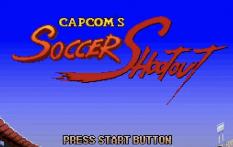 Rejouer à la Super Nintendo est toujours une expérience particulière. Car il ne s’agit pas juste de démarrer un jeu vidéo. Il y a tout un rituel à respecter. La Super Nes ne marche jamais du premier coup. Jamais. Il faut d’abord prendre la cartouche, l’insérer une première fois, l’allumer (avec ce bruit « tac » au moment d’allumer), constater que l’écran reste noir, éteindre, sortir la cartouche et faire LE geste que tous les enfants ayant grandi dans les années 1990 connaissent : souffler dans la cartouche. Puis éventuellement souffler dans la console, ça ne peut pas faire de mal. Opération qui nécessite parfois d’être répétée deux ou trois fois. Mais cela finit toujours par marcher. Et quand le jeu se lance enfin, c’est parti. Aujourd’hui, c’est Soccer Shootout. Et le premier écran qui apparaît immédiatement est bleu, avec la mention « 1994 Epoch Co. Ltd. Shogakukan Production Co. Ltd. », suivi très rapidement du mythique Capcom. Une petite animation de quelques secondes avec deux joueurs aux maillots douteux, et on arrive sur l’écran de démarrage permettant d’accéder au menu.