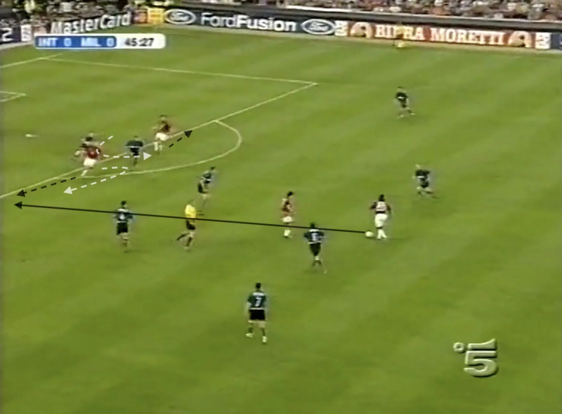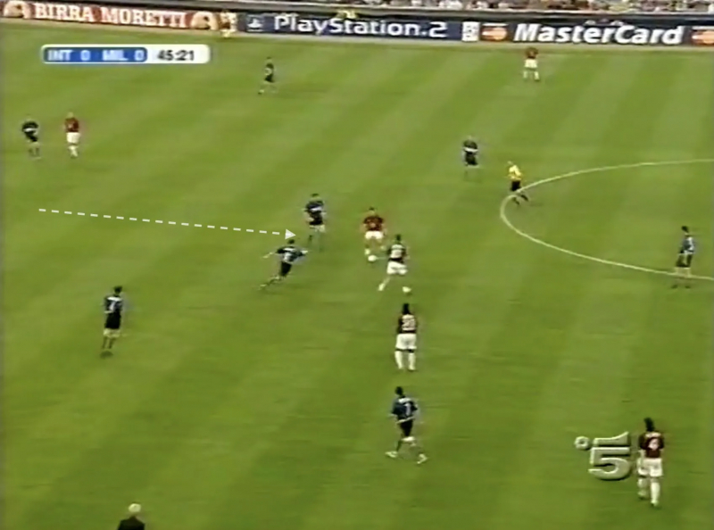 Il faut noter, quand même, qu’Emre, aligné piston gauche, a eu du mal à exister et a souffert sous les fusées envoyées par Pirlo en direction de Costacurta. Il faut surtout rappeler qu’entre les quarante-cinq premières minutes et la seconde période, il y a eu un temps additionnel et que c’est là que tout a basculé : Rui Costa, trouvé par Kaladze au niveau de la ligne médiane, a alors fait sortir Cristiano Zanetti, puis est reparti avec Maldini qui a ensuite touché Gattuso derrière les milieux interistes, faisant grimper d’un cran Materazzi et troublant l’équilibre de la bande de Cúper, déjà structurellement fragile sur le papier face au losange du 4-3-1-2 d’Ancelotti. Pour la seule fois du match, voire de la double confrontation, Clarence Seedorf a donc pu envoyer Inzaghi et Shevchenko en un contre un face à Córdoba et Cannavaro, le premier embrouillant les pistes et le second se chargeant de transformer la situation en explosion après un subtil crochet posé sur Córdoba.