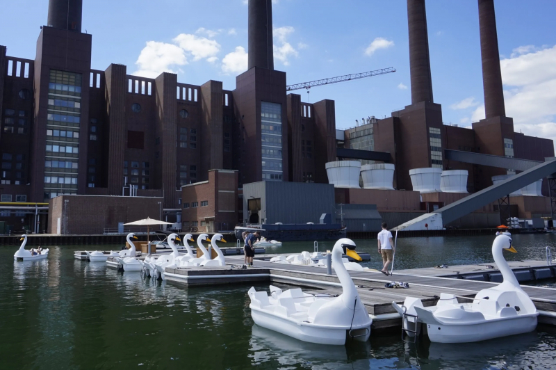 En traversant le Mittellandkanal, le plus long d’Allemagne avec ses 325 kilomètres, on accède directement au Disneyland local : Autostadt. Un parc d’attractions ouvert par la firme en 2002 et qui, en plus d’un musée à sa gloire, propose le temps de l’été une foultitude d’attractions gratuites allant de structures gonflables à un circuit de petites autos électriques, en passant par une plage artificielle et des balades en pédalo en forme de cygne à l’ombre de l’ancienne centrale thermique, l’un des bâtiments historiques du site, toujours en activité depuis son érection en 1938, année qui coïncide avec la fondation de Wolfsburg, passé d’un petit hameau connu pour son château du XIVe siècle à une place forte de l’industrie automobile mondiale.