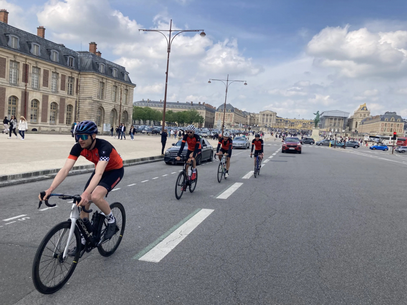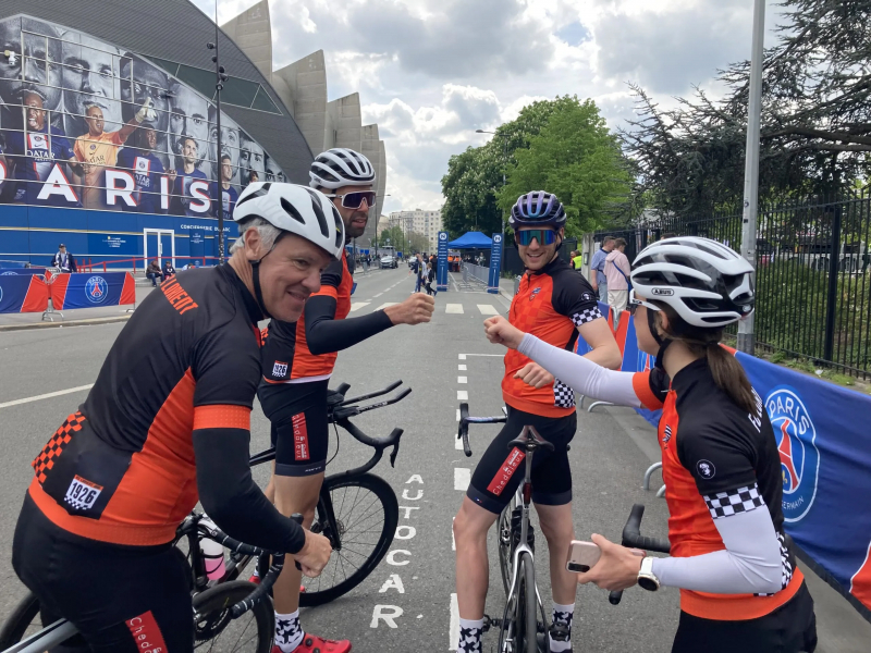 « Martin nous a préparé un itinéraire sympa, à l’image de sa com au FC Lorient, c’est carré et bien ficelé », salue Mathieu qui enchaîne les pétards en danseuse en tête de peloton avec Pierre-Yves, alors que le convoi reprend sa route direction Paris, sur les boulevards royaux de Versailles. « Il a été devant quasiment tout le long, il a pris le vent pour tout le monde, même si à 35 ans, il décline… », tacle Mathieu. « Je me reconvertis en supporter du coup », répond, du tac au tac, l’ingénieur. Dans leurs roues, Pauline, seule femme du groupe, tient la cadence : « Elle pourrait rouler encore 300 bornes demain », assure Mathieu, son conjoint. Mais la jeune femme se projette plutôt sur la douche et l’apéro qui attendent le peloton dans un gymnase qui jouxte le Parc des Princes.