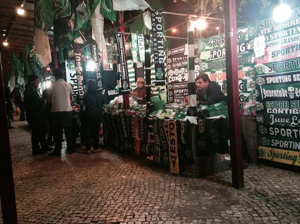 « On ne gagne pas la guerre en remportant une bataille. » Le tifo des ultras sportinguistas est on ne peut plus clair. Il ne faut pas se contenter de la fessée infligée à Benfica la semaine dernière 3-0. La route sera longue jusqu’au titre. Ce n’est d’ailleurs pas un hasard si, sous la première banderole, un second tifo rappelle qu’il « en reste 26 » (matchs). Trop sérieux, les supporters du Sporting ? Pas tellement. Deux heures avant le coup d’envoi du match contre Estoril, de nombreux groupes de supporters chambraient encore les Aigles déplumés à coups de « filhos da p*** SLB » . Le tout en chanson. Pour la finesse, on repassera. Le coin nourriture, situé une vingtaine de mètres face à l’entrée principale, n’est pas moins gras. Bifanas, churros, sandwichs, burgers, dégueulasseries en tout genre et bières à n’en plus finir… À Alvalade, on bouffe beaucoup et très mal avant les matchs. Un peu comme dans les trois quarts des stades de foot, en fait. Moyennant 5 euros, il y a de quoi se remplir la panse et ne pas mourir de soif pendant 90 minutes. 5 euros, c’est d’ailleurs le prix d’à peu près tout dans le coin. Écharpes vendues à la sauvette ou en stand, gadgets et autres objets divers, rien n’est plus ou moins cher. Une certaine conception de l’économie.
