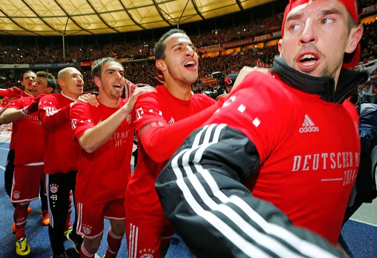 Du côté du Hertha, seul Adrian Ramos surnage. Le remplaçant annoncé de Lewandowski à Dortmund se bat face aux monstres Dante et Boateng. Quand il arrive à passer le nouveau meilleur 6 du monde, Phillip Lahm. C’est d’ailleurs le Colombien qui réduit le score sur pénalty en seconde mi-temps. Il est temps de faire entrer Ribéry. Le Français s’amuse avec Götze, et plante un magnifique piqué. 3-1, le Bayern est le champion le plus rapide de l’histoire de la Bundesliga, battant son propre record d’une journée. Gavés de succès, les fans du Bayern explosent tranquillement. Les « Supa Bayern, Supa Bayern, hé, hé » redoublent, on craque des cigares et on se claque des bises. Pep Guardiola rentre directement aux vestiaires. Le Catalan avait annoncé vouloir échapper à la tradition de la douche à la bière. Thomas Müller, mégaphone à la main, chauffe le virage. Et les joueurs du Bayern rendent hommage à Bézu avec une belle chenille. Menée bien sûr par Francky. Dante enchaîne lui des pas de danse en bon Brésilien. Chacun son domaine de compétence. Un peu à l’écart, Jérôme Boateng profite. Né à Berlin et formé au Hertha, il est sacré là où tout a commencé pour lui. Il sait qu’il reviendra. Pour la finale de la Coupe d’Allemagne. 22h30, rideau. Les joueurs du Rekordmeister s’apprêtent à passer la nuit dans le quartier hype de Mitte. Les fans du FCB n’oublient pas de passer le bonjour au Borussia Dortmund et entonnent « BVB, Huhrensöhne » , soit BVB fils de « mamans qui travaillent » . Pas d’excès à attendre ce soir. Il faut garder ses forces pour un nouveau triplé.
