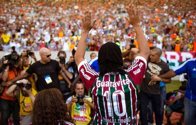 Fête tricolore à Rio. Pas pour les volleyeurs français, qui ont remporté la Ligue mondiale quelques heures plus tôt au Maracanãzinho, salle multisports à l’ombre du mythique stade de foot. Les dizaines de milliers de maillots tricolores (vert, blanc et grenat) affluent vers le « vrai » Maracanã, pour recevoir comme il se doit un adepte des nuits parisiennes, mais bien Brésilien, pour le coup : Ronaldinho. Si l’enceinte reçoit l’affluence des grands jours, ce n’est pas seulement pour saluer l’arrivée du crack, qui n’est que l’apéro d’un Clásico contre le Vasco, rival honni que le Fluminense n’est pas foutu de battre depuis trois ans. En cas de victoire, Fred et ses potes s’emparent de la tête du championnat. C’est aussi l’occasion d’enfoncer encore plus les Vascainos dans la mouise. Relégable, l’ancien club de Juninho avait aussi tenté de rapatrier Ronnie, mais s’est pris un râteau, alors que le président Eurico Miranda, ancien député véreux, avait annoncé que le deal était bouclé à 90%. Une fois le contrat signé, Fluminense n’a pas raté l’occase : 90 + 10 = 100% tricolor, a raillé le club sur les réseaux sociaux, le tout illustré avec une photo du joueur arborant un maillot floqué du 10.