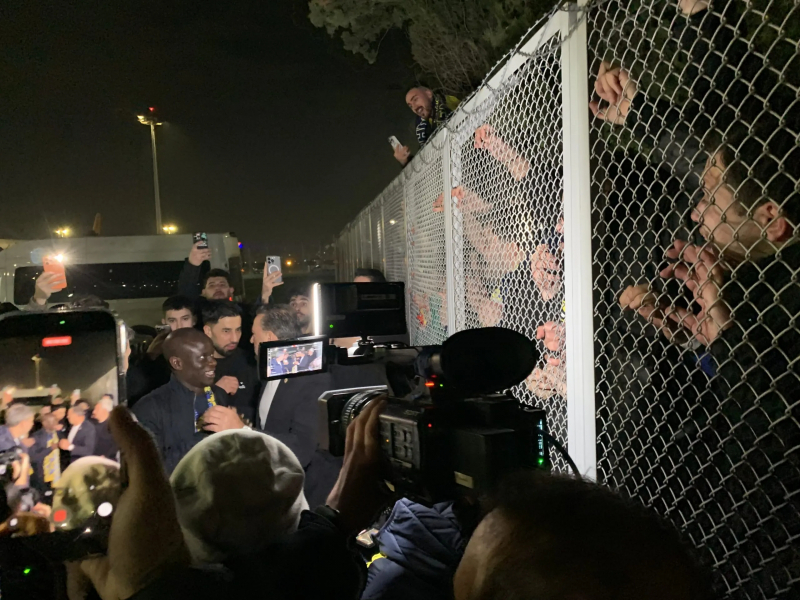 Quelques mètres devant la grille où étaient massés des centaines de fans, une trentaine de caméras étaient braquées sur l’entrée de l’aéroport, et ont rapidement débordé de leur zone réservée pour suivre le milieu de terrain. Entouré d’une foule de journalistes et de membres du club, il s’est avancé vers le grillage blanc où étaient parqués les fanatiques du club. Perché dans un arbre, un supporter hurlait « Kanté » depuis déjà une bonne demi-heure, à s’en rompre les cordes vocales. Les Fenerli sont devenus fous lorsqu’ils ont aperçu la silhouette de leur nouveau joueur, à grand renfort de fumigènes et de chants à sa gloire.